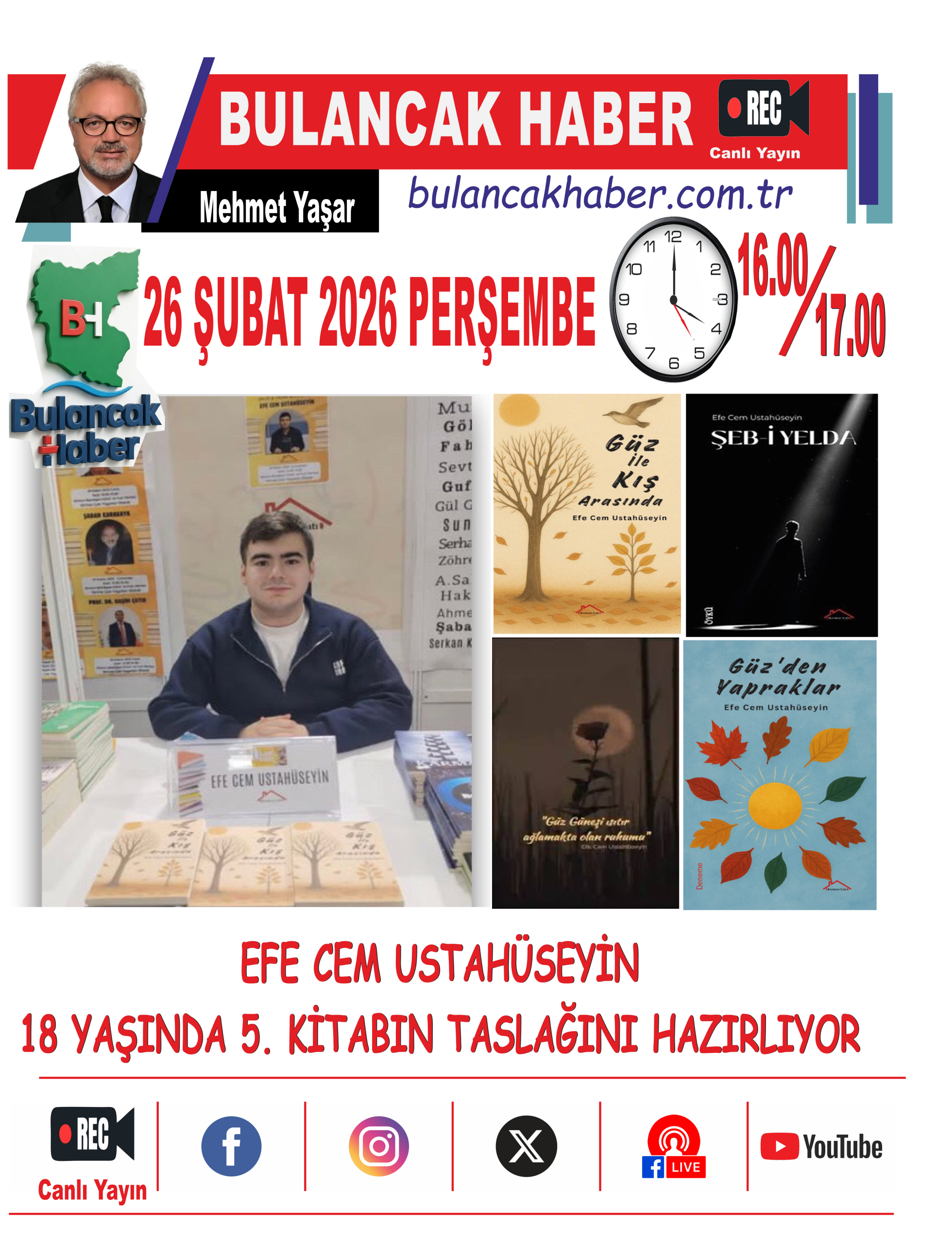 Efe Cem Ustahüseyin, 26 Şubat 2026 Perşembe günü saat 16.00–17.00 arasında Bulancak Haber canlı yayın konuğu olacak. Genç yazarın edebiyat yolculuğunu ve yeni kitabına dair çalışmalarını anlatacağı programın yoğun ilgi görmesi bekleniyor.