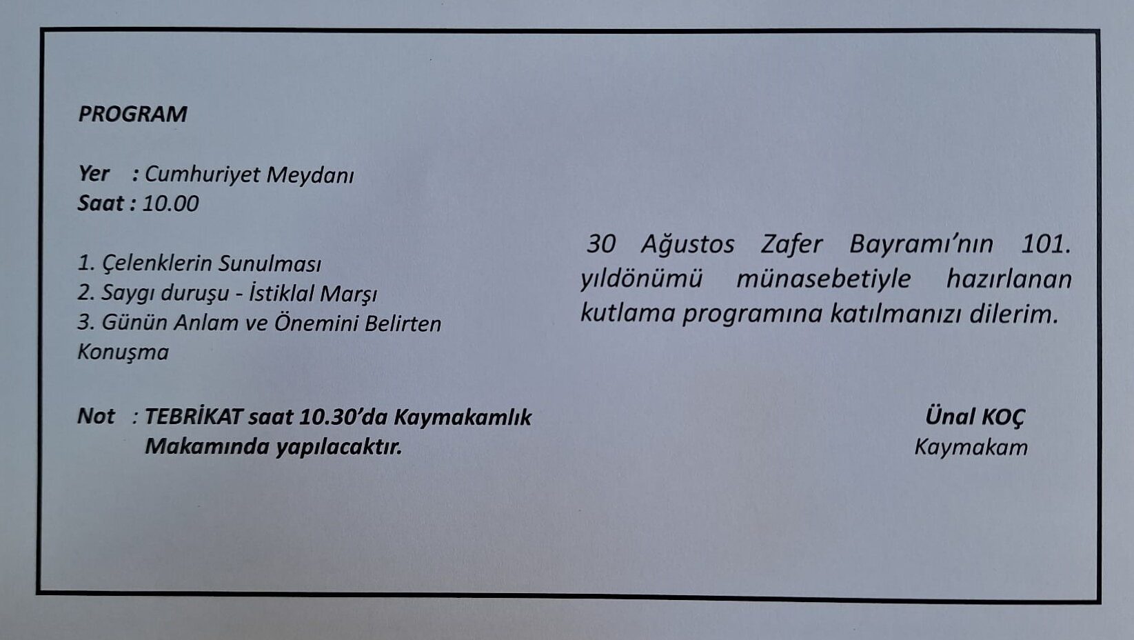 30 Ağustos Zafer Bayramı’nın 101. Yıldönümü münasebetiyle Bulancak kaymakamı Ünal Koç, “TEBRİKAT” programını saat:10.30’da Kaymakamlık Makamında yapılacağını duyurdu.