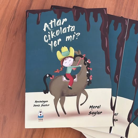 Kitabın kapağında, hayal gücüyle atın üzerinde yolculuğa çıkan sevimli bir çocuk figürü yer alırken, üst bölümdeki çikolata akışını andıran tasarım detayları başlıkla tatlı bir bütünlük oluşturuyor. Resimleriyle hikâyeye renk katan Deniz Bozkır, anlatının sıcaklığını görsel dünyaya başarıyla taşıyor.