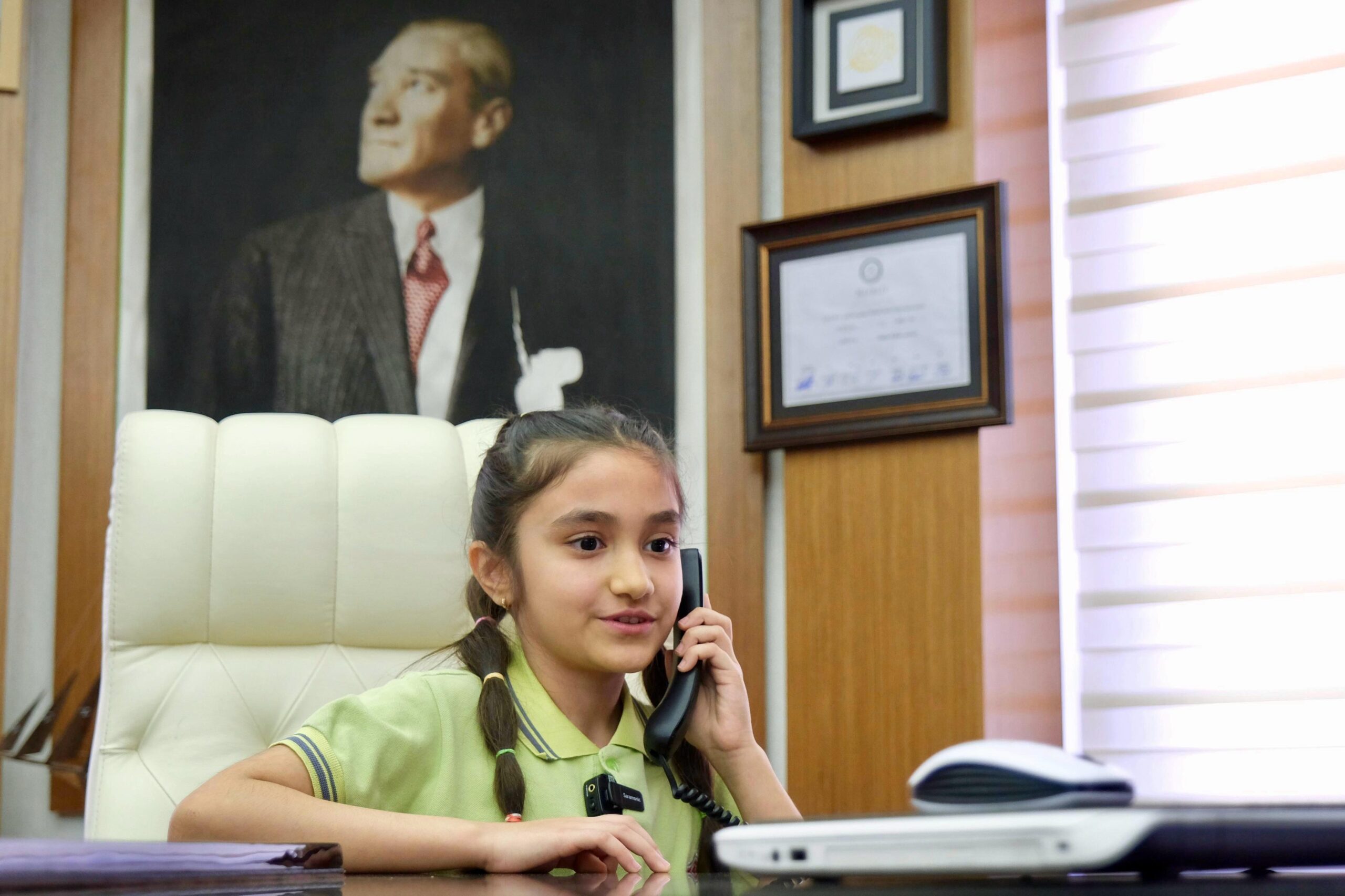 Koltuğa oturan Abacıbükü İlköğretim Okulu 4-A sınıfı öğrencisi Berra Yurt, bir süre belediye başkanının rolünü üstlenerek belediyenin yönetiminde söz sahibi oldu.