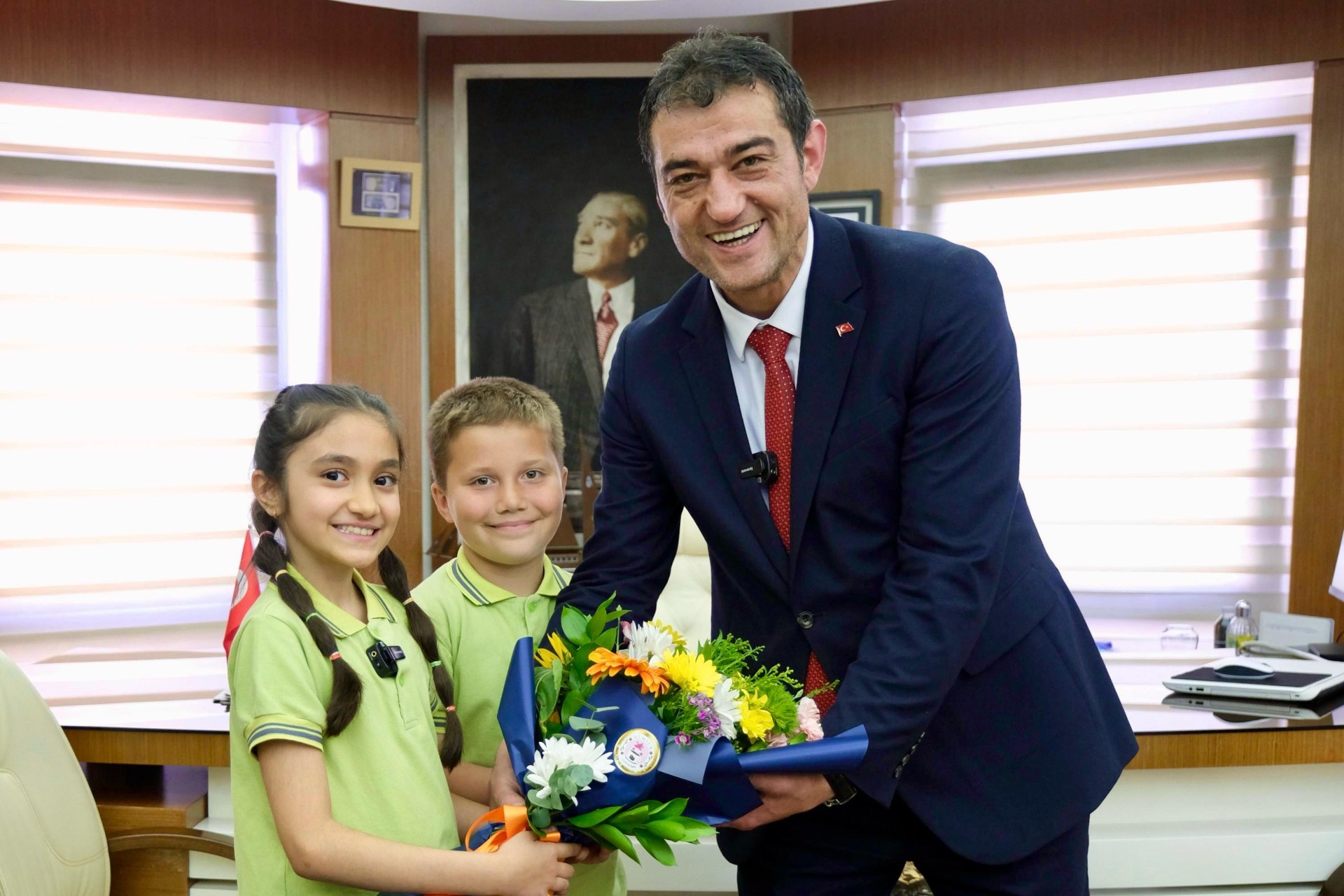 Öğrenciler Berra Yurt ve İbrahim Yahya Durmuş Belediye Başkanı Fuat Köse’ye çiçek verirken, Başkan Köse’de kendilerine satranç oyunu takımı hediye etti.