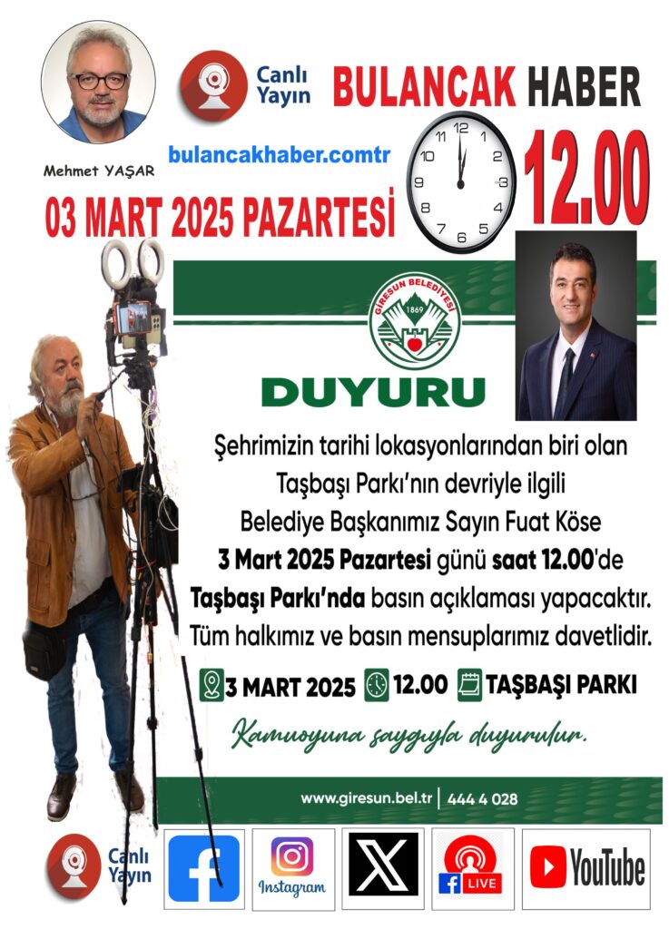 Ayrıca, Bulancak Haber Genel Yayın Yönetmeni Mehmet Yaşar, açıklamanın canlı yayınla izleyicilere aktarılacağını belirtti. Yaşar, Taşbaşı Parkı’na dair yapılacak açıklamaları canlı olarak sunarak izleyicilere doğrudan aktaracak.