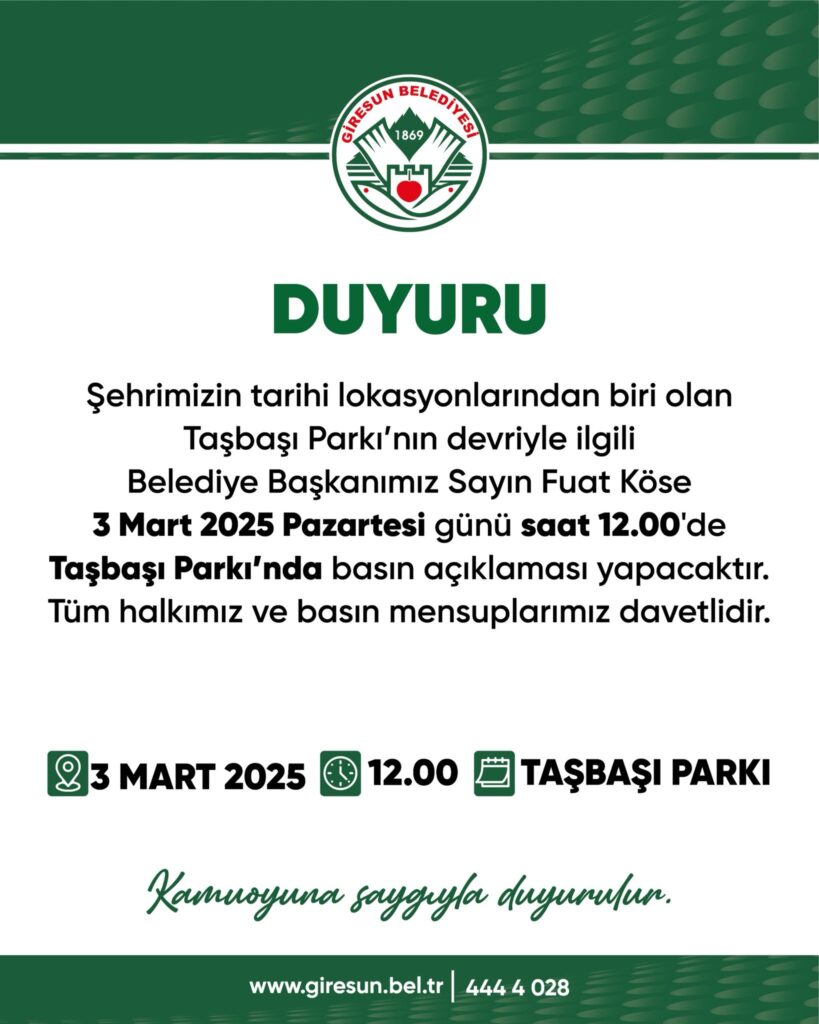 Giresun halkı ve basın mensupları, 3 Mart Pazartesi günü saat 12:00’de yapılacak bu önemli açıklamayı Taşbaşı Parkı’nda takip edebilecekler.