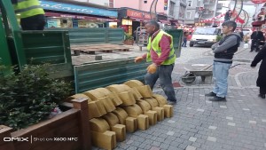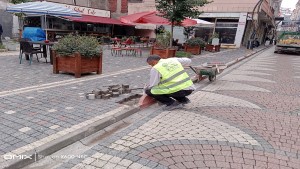 Bu arada kırmızı yüksek kaldırım taşlarının kırılarak çıkartıldığı ve yerine aynı ölçüde sarı renkte yeni taşların itina ile yerleştirildiği objektiflerimize böyle yansıdı.
