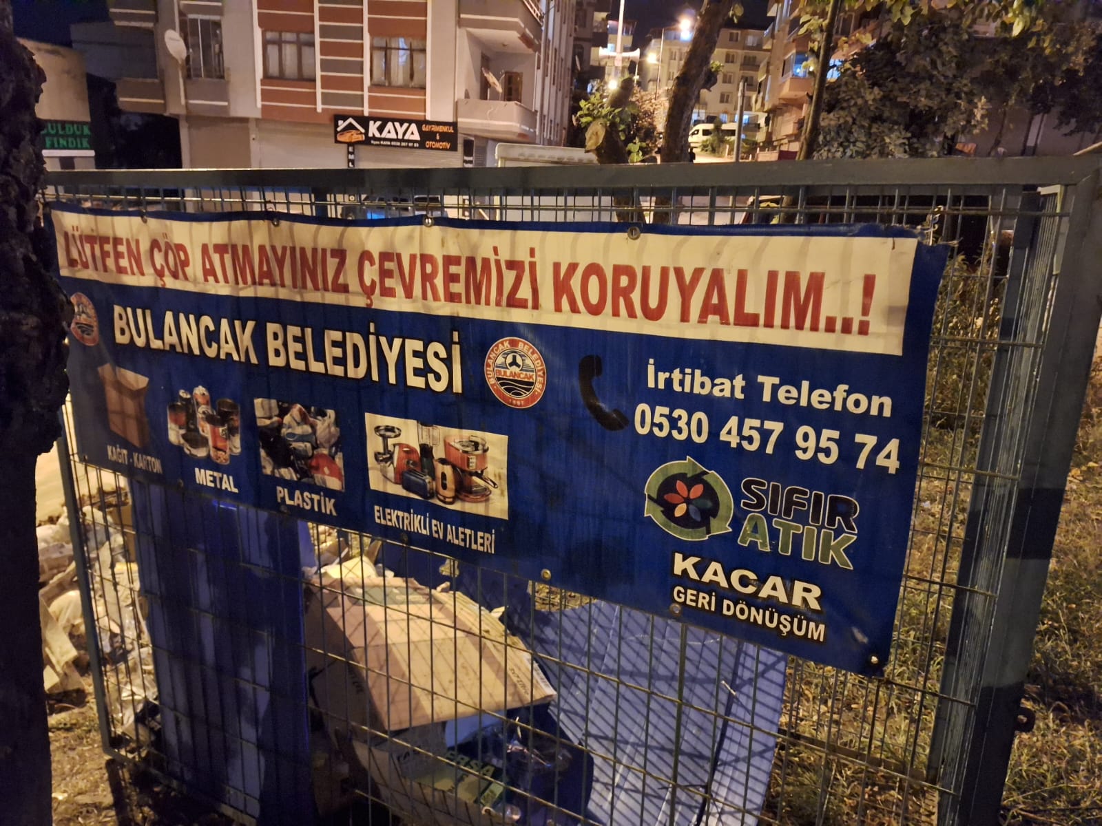 KÂĞIT-KARTON/ METAL / PLASTİK / ELEKTRİKLİ EV ALETLERİ için bırakılan ve BULANCAK BELEDİYESİ SIFIR ATIK adı altında geri dönüşümlü yol ortasında ki yeşil alanın çöp toplama kafesi yerleştirildi.