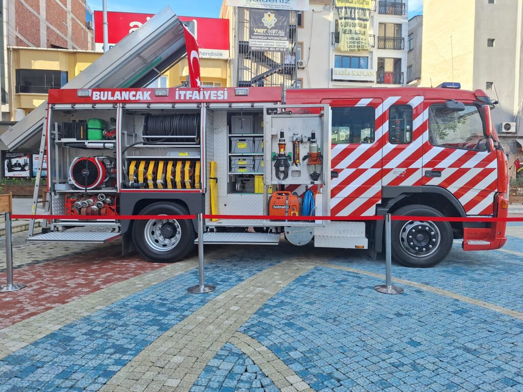 Cumhuriyet Meydanı’ndaki tanıtım etkinliğinde, yeni itfaiye aracının ilçemizin güvenliği açısından önemli bir kazanım olduğu vurgulandı.