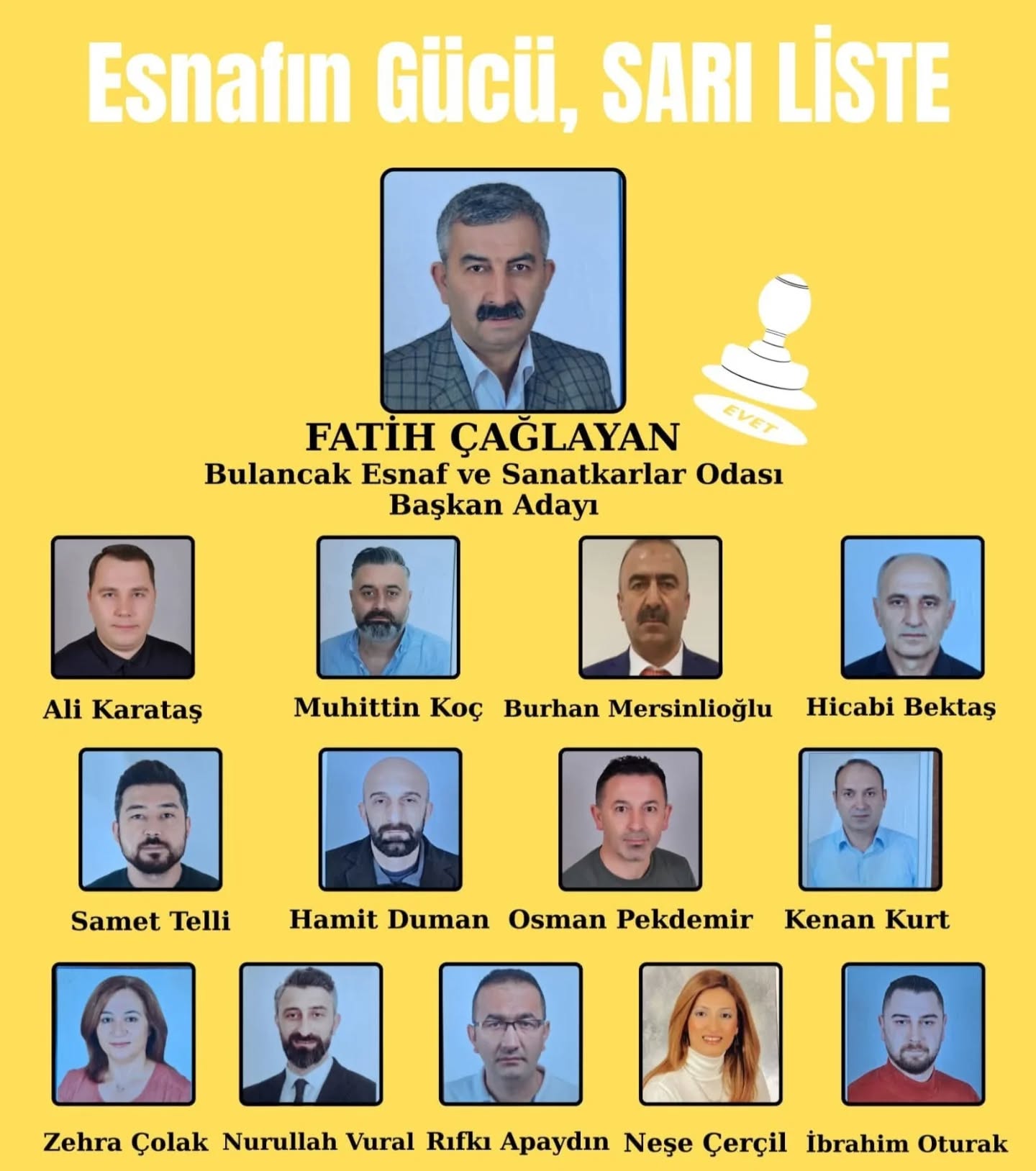 Çağlayan, “Bugün kazanan bir liste değil, Bulancak esnafı olmuştur. Oy kullanan, kullanamayan, destek veren ya da vermeyen tüm esnaflarımıza gönülden teşekkür ediyorum. Bundan sonra ayrım yapmadan, herkesin başkanı olacağım. Odamızı ortak akıl ve istişareyle yönetecek, esnafımızın sorunlarına birlikte çözüm üreteceğiz” ifadelerini kullandı.