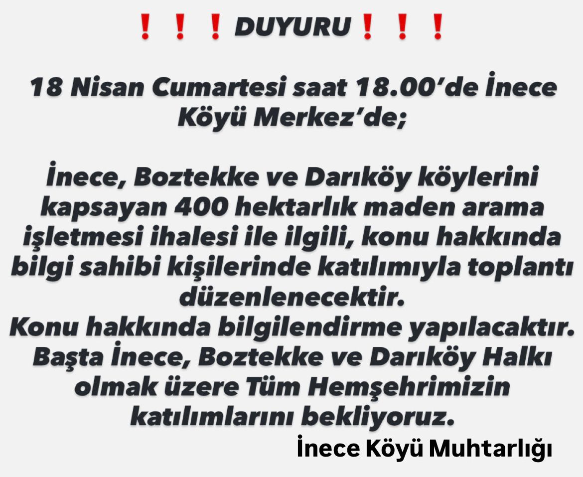 İnece, Boztekke ve Darıköy’ü kapsayan yaklaşık 400 hektarlık maden arama sahasıyla ilgili ihale süreci öncesinde, bölge halkı bir araya gelmeye hazırlanıyor.