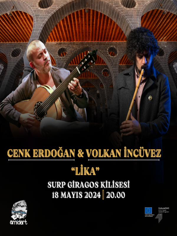 Cenk Erdoğan ve Volkan İncüvez’in “Lika” adlı bu özel konseri kaçırmayın. Kendinizi benzersiz bir müzikal serüvenin içinde bulmak için 18 Mayıs Cumartesi günü Surp Giragos Kilisesi’nde buluşalım.