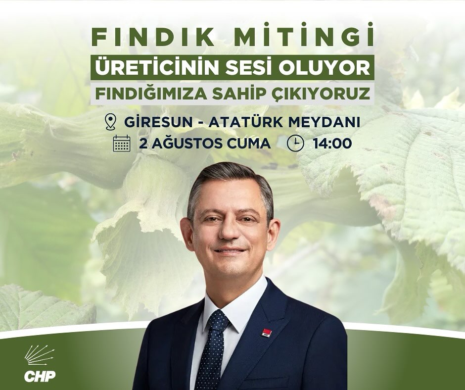 Fındık üreticilerinin karşı karşıya kaldığı fiyat belirsizliği ve bu belirsizliğin yarattığı mağduriyetlere dikkat çekmek amacıyla Cumhuriyet Halk Partisi (CHP), Giresun’da bir miting düzenleme kararı aldı. “Üreticinin Sesi Oluyor, Fındığımıza Sahip Çıkıyoruz” sloganıyla yapılacak olan miting, 2 Ağustos tarihinde saat 14.00’te Giresun Atatürk Meydanı’nda gerçekleştirilecek.