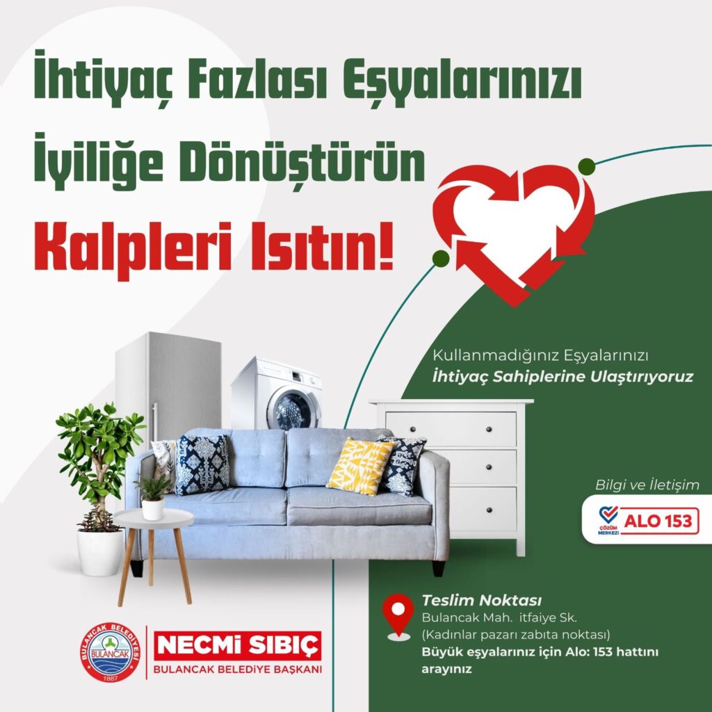Belediye Başkanı Necmi Sıbıç’ın talimatı ile başlatılan proje kapsamında, ihtiyaç fazlası ve kullanılabilir durumda olan ev eşyaları; koltuk, çekyat, sandalye, masa, yatak, beyaz eşya vb. ev eşyaları toplanarak ihtiyaç sahiplerine dağıtılacak.