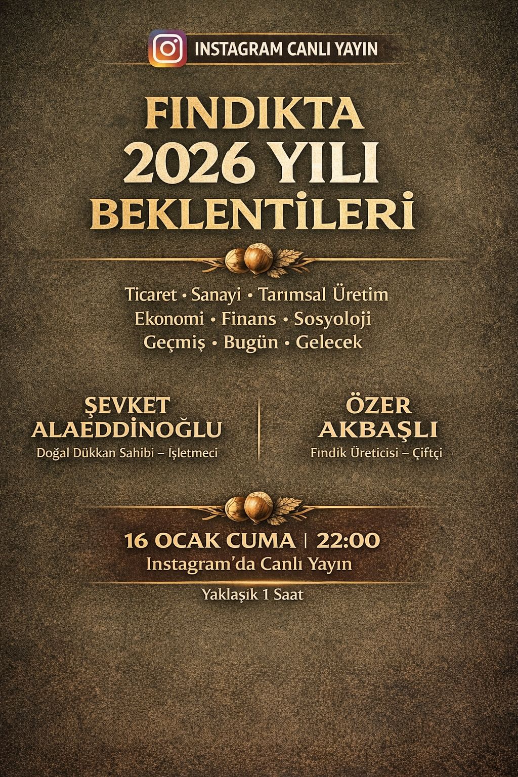 “Fındıkta 2026 Yılı Beklentileri” başlığıyla gerçekleştirilecek canlı yayında; ticaret, sanayi, tarımsal üretim, ekonomi ve finans başlıkları çok yönlü şekilde değerlendirilecek.