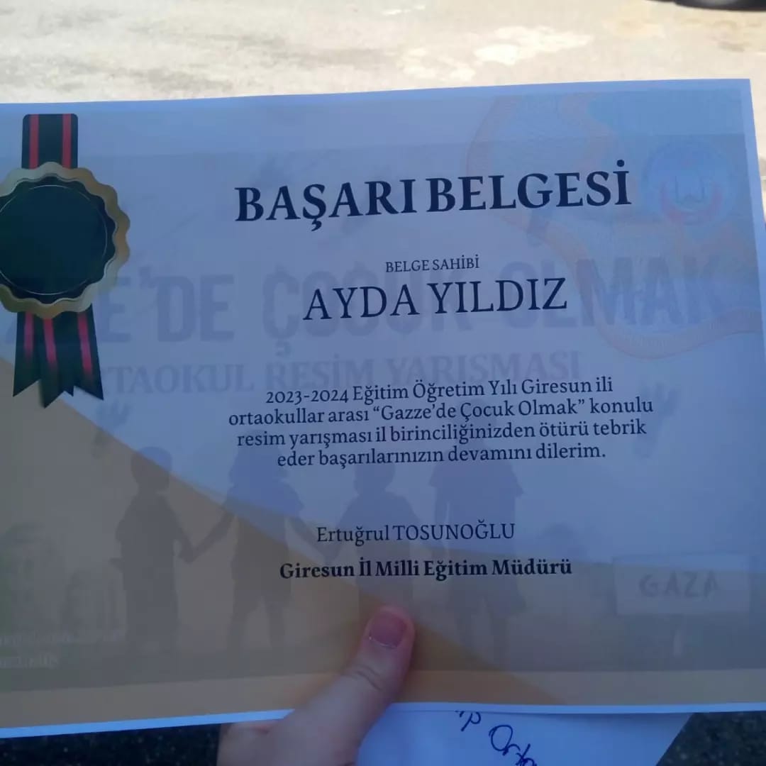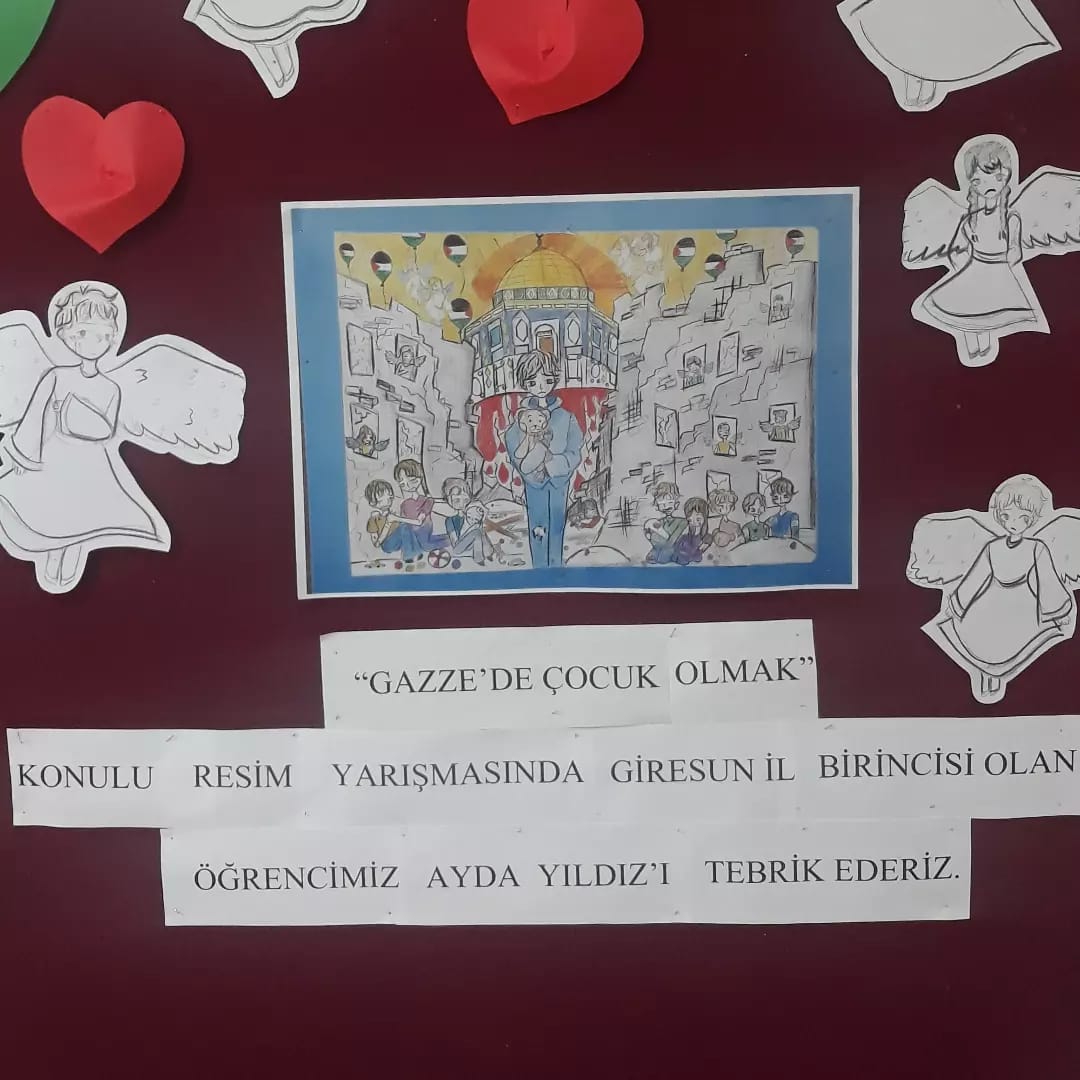 Bulancak İmam Hatip Ortaokulu’ndan Ayda Yıldız, bu anlamlı yarışmada birinci olarak hem okulunu hem de ailesini gururlandırdı. Ancak bu başarı, sadece birincilikle sınırlı değildi. Ayda, Gazze’deki çocukların yaşadığı acıları ve zorlukları büyük bir duyarlılıkla kağıda dökerek, aslında çok daha büyük bir mesaj verdi.