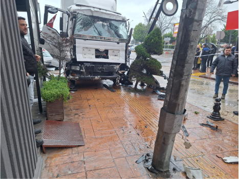 Şehir girişinde freni boşalan bir kamyon, önündeki araçlara çarptıktan sonra kaldırımdaki saksılara ve bir elektrik direğine vurarak ancak durabildi.