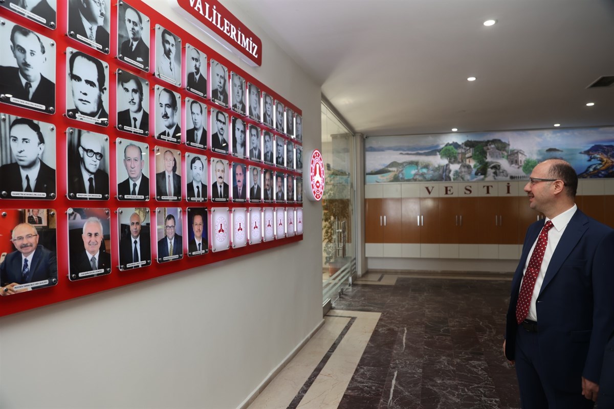 Ardından, karşılama heyeti ile birlikte günün anısına fotoğraf çektiren Vali Serdengeçti, görev yapmış valiler tablosunu da yakından inceledi.