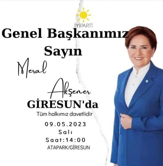 09 Mayıs 2023 Salı günü İYİ Parti Genel BaÅŸkanı Meral AkÅŸener Giresun Ata Park’ ta Saat: 14.00’da Giresun halkına hitap edecektir.