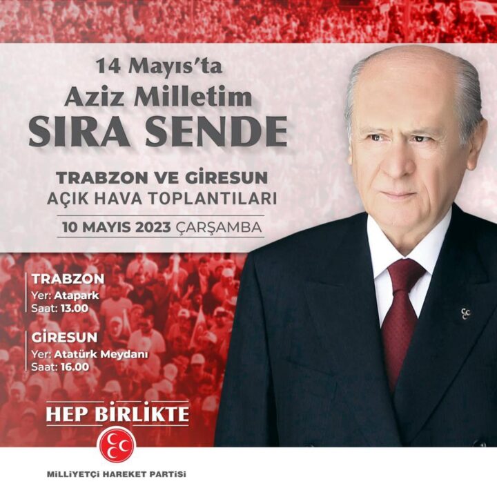 10 Mayıs 2023 ÇarÅŸamba günü Milliyetçi Hareket partisi Genel BaÅŸkanı Devlet Bahçeli Giresun Ata Park’ ta Saat: 16.00’da Giresun halkına hitap edecektir.