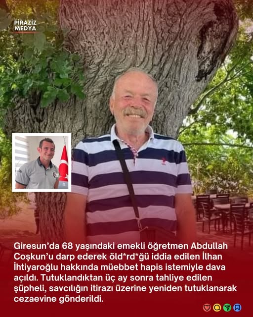 Emekli öğretmen Abdullah Coşkun’un ölümü, Giresun’da eğitim camiası ve vatandaşlar arasında büyük üzüntü yaratmıştı. Uzun yıllar öğretmenlik yaptığı belirtilen Coşkun’un çevresinde sevilen ve saygı duyulan bir isim olduğu ifade ediliyor.