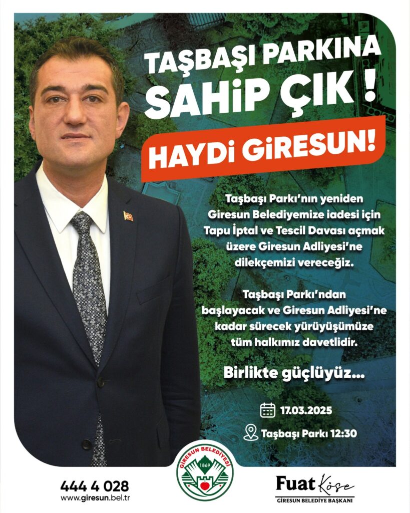 Köse, yaptığı açıklamada, “Taşbaşı Parkı’nın yeniden Giresun Belediyesi’ne iadesi için tapu iptal ve tescil davası açmak üzere Giresun Adliyesi’ne dilekçemizi vereceğiz. Bu süreçte Taşbaşı Parkı’ndan başlayarak Giresun Adliyesi’ne kadar bir yürüyüş düzenleyeceğiz. Tüm halkımızı bu yürüyüşe davet ediyoruz. Birlikte güçlüyüz!” dedi.