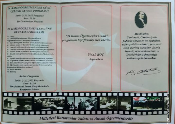 Bulancak Kaymakamı Ünal Koç’un belirledi program, Atatürk’ün “DÜNYANIN HER TARAFINDA ÖĞRETMENLER TOPLUMUN EN FEDAKÂR VE SAYGI DEĞER UNSURLADIR” sözleri eşliğinde 24 Kasım 2022 Perşembe saat: 10.00’da Bulancak Cumhuriyet Meydanı’nda başlayacağını öğrenildi.