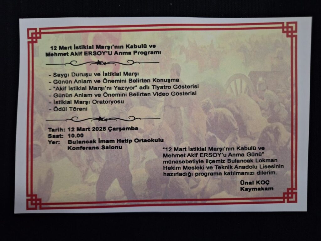 Bulancak İlçe Kaymakamı Ünal Koç, 12 Mart İstiklal Marşı’nın kabulü ve Mehmet Akif Ersoy’u anma günü programını duyurdu. Bu özel etkinlik, Lokman Hekim Mesleki ve Teknik Anadolu Lisesi tarafından hazırlandı. Öğrenciler ve öğretmenler tarafından gerçekleştirilecek olan programda, İstiklal Marşı’nın kabulü ve Mehmet Akif Ersoy’un hayatı, edebi kişiliği ve Türkiye’nin bağımsızlık mücadelesindeki önemi vurgulanacak.
