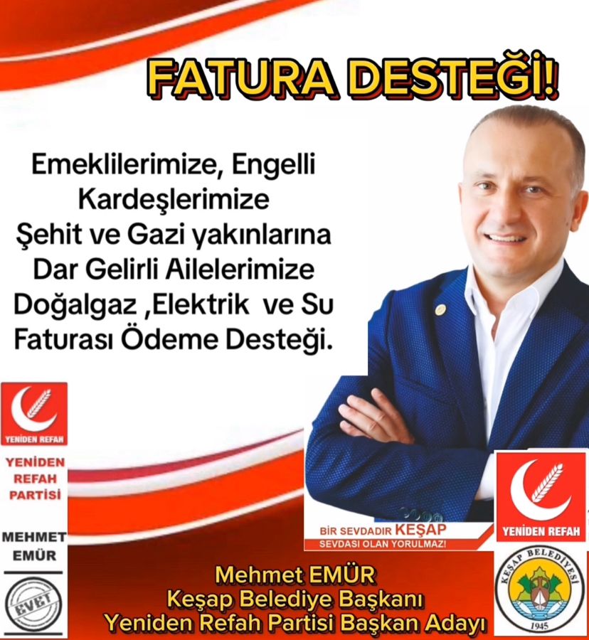 Açıkladığı yapılabilir ve gerçekti projelerle Giresun’da fark yaratan Başkan Emür, 31 Mart 2024 Mahalli İdareler Seçimleri’nde Keşap halkının kendisine yeniden yetki vermesi halinde, dar gelirli, emekli, engelli, şehit ailesi ve gazilere doğalgaz, elektrik ve su faturası desteği sağlanacağını açıkladı.