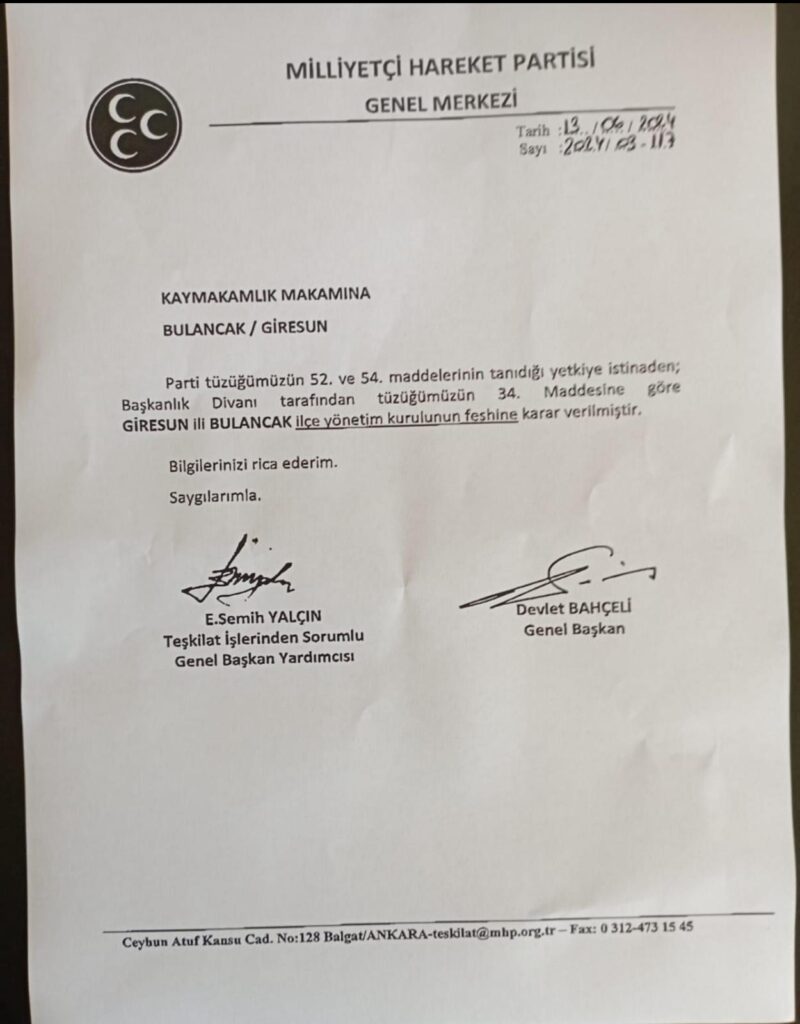 MHP Genel Merkezi tarafından Bulancak Kaymakamlığı’na gönderilen resmi yazıda ise, MHP Bulancak İlçe Teşkilatı’nın feshedildiği bildirildi. Genel Başkan Devlet Bahçeli ve MHP Genel Başkan Yardımcısı, Teşkilat İşlerinden Sorumlu Semih Yalçın’ın imzalarını taşıyan bu karar, MHP tüzüğünün 34. maddesi gereğince alınmış olup, ilçe teşkilatının yeniden yapılandırılması amacıyla alındığı belirtiliyor. Fesih kararının gerekçesi hakkında ise detaylı bir açıklama yapılmadı.