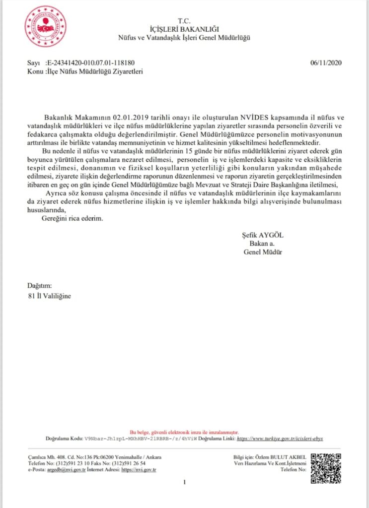 Nüfus ve Vatandaşlık Genel Müdürlüğü’nün 6.11.2020 tarih ve 11.880 sayılı talimatı gereğince, il müdürlerinin ilçe nüfus müdürlüklerini 15 günde bir ziyaret ederek, çalışmalara nezaret etmesi, personelin iş ve işlemlerindeki kapasite ve eksikliklerin tespit etmesi vb. durumlarla ilgili değerlendirme raporu hazırlaması, hazırlanan raporun da Genel Müdürlüğe gönderilmesi istenilmektedir.