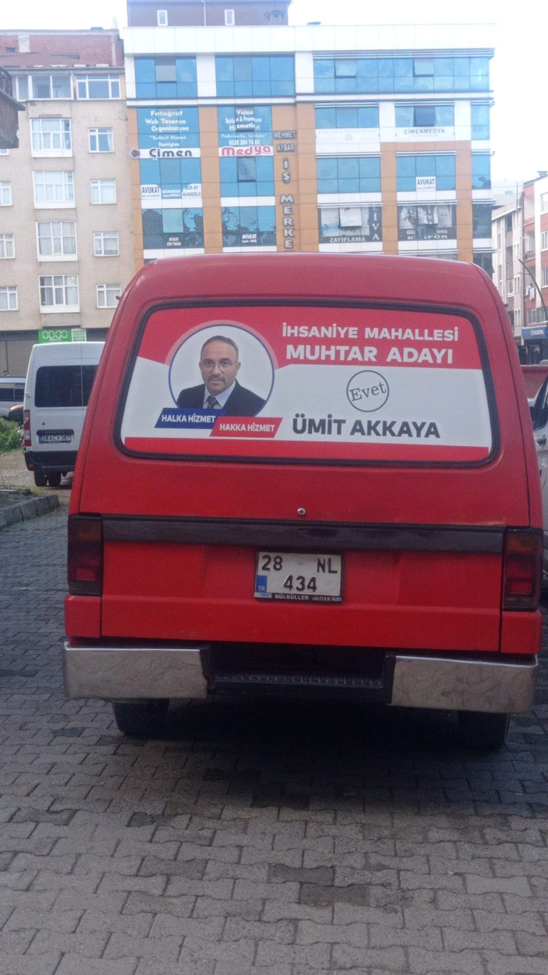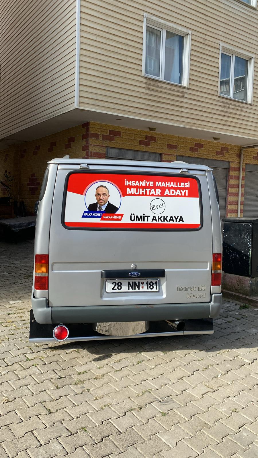 Bulancak İhsaniye Mahallesi’nden Muhtar Adayı Ümit Akkaya’ya sevgilerini “HALKA HİZMET HAKK’A HİZMET” sloganı ile araçlarına Akkaya’nın resmini yerleştirdikleri bu sevginin sonuçlarda büyük etkisi olacağını şimdiden gösterdiği görüldü.
