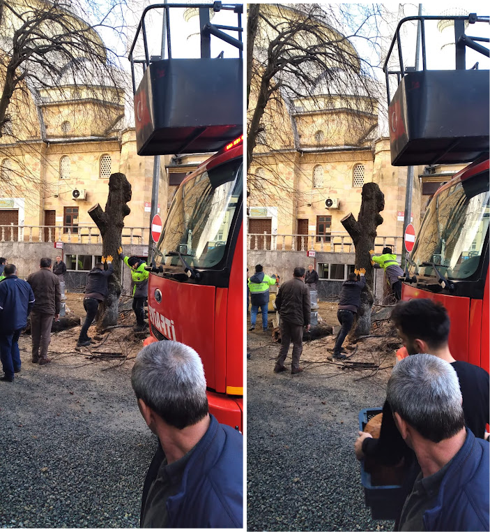 Ağacın kesildiğini söyleyenler hiç olmazsa biz gelene kadar neden engel olmadılar. Ben bölgeye gittiğimde bir ağaç kesilmiş bir diğer ağacın fazla uzanan dallarını budama yapıyoruz dediler. Diğer ağaç neden kesildi sorumuza ise çürüdü diye kesildiğini ifade ettiler.