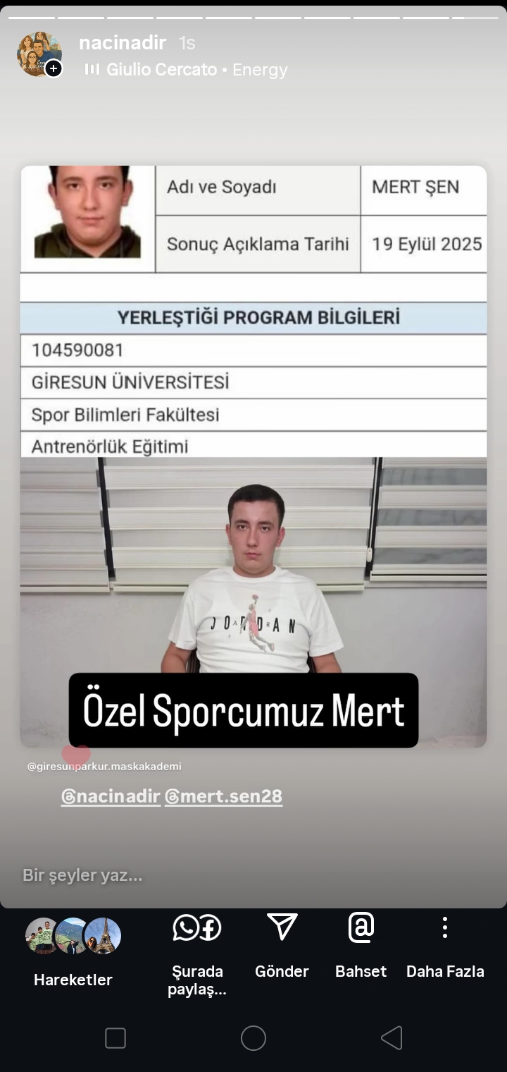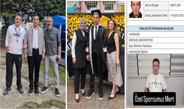 Otizm tanılı öğrenci Mert Şen, Yükseköğretim Kurumları Sınavı (YKS) ve ardından girdiği Özel Yetenek Sınavı (ÖZYES) sürecinde gösterdiği üstün performansla Giresun Üniversitesi Spor Bilimleri Fakültesi Antrenörlük Eğitimi Bölümü’ne yerleşmeye hak kazandı.