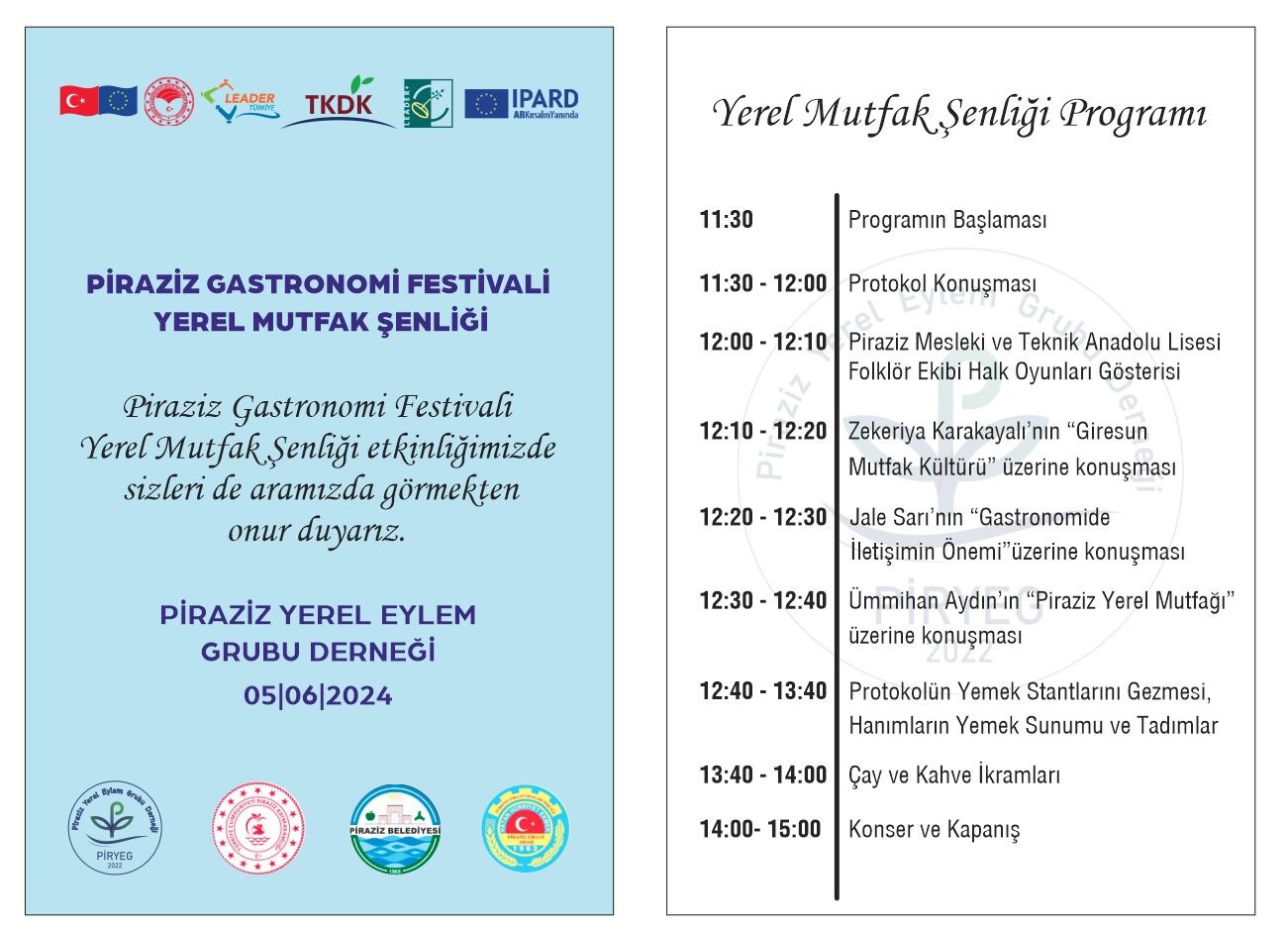 Piraziz Yerel Eylem Grubu Derneği tarafından düzenlenen Piraziz Gastronomi Festivali Yerel Mutfak Şenliği, 5 Haziran Çarşamba günü saat 11.30’da başlıyor.