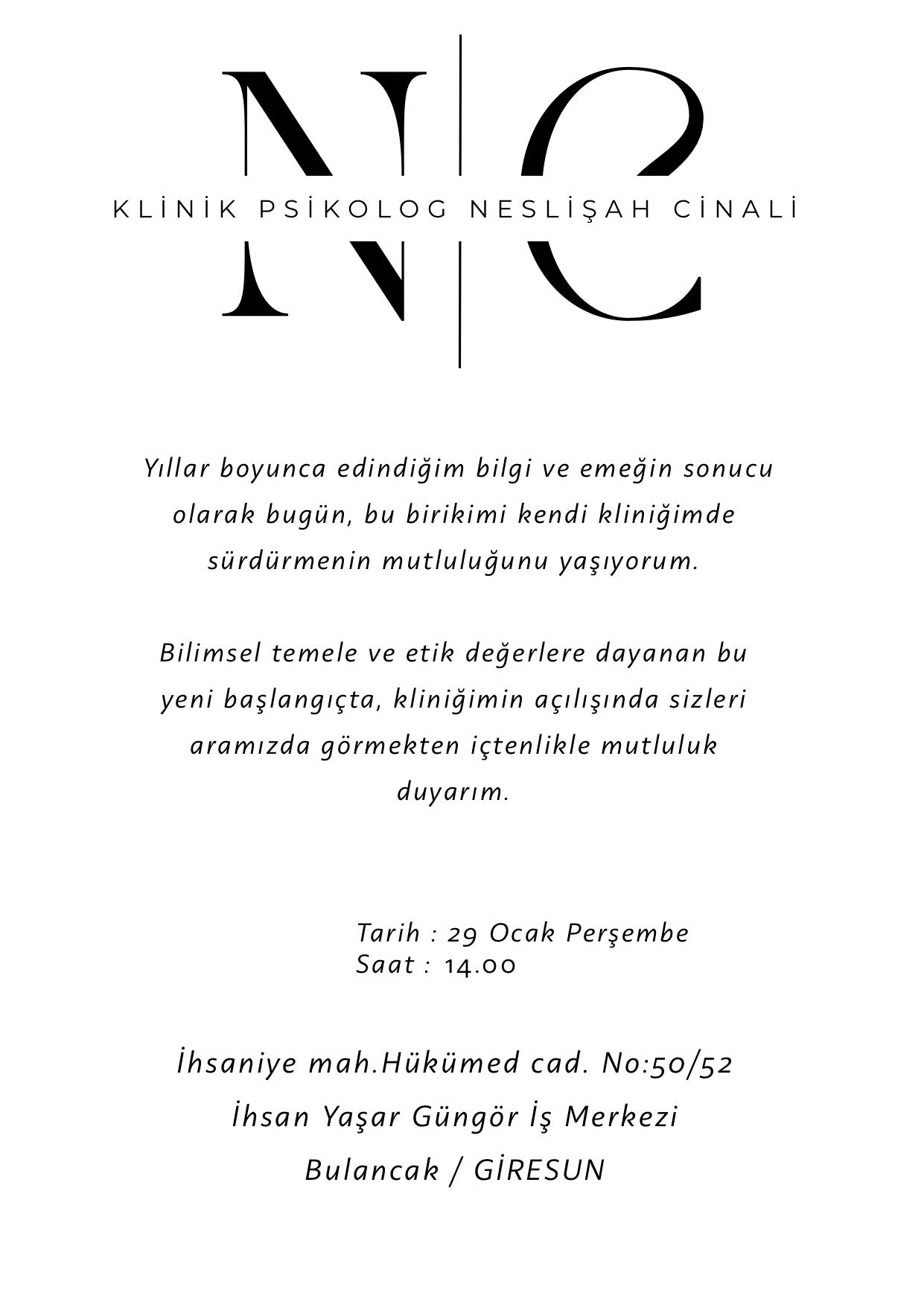 Ruh sağlığı alanında bilimsel yaklaşımı, etik duruşu ve insani temas odaklı çalışmalarıyla dikkat çeken Klinik Psikolog Neslişah Cinali, kendi kliniğinin açılışını gerçekleştiriyor.