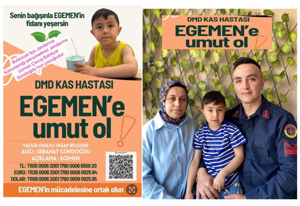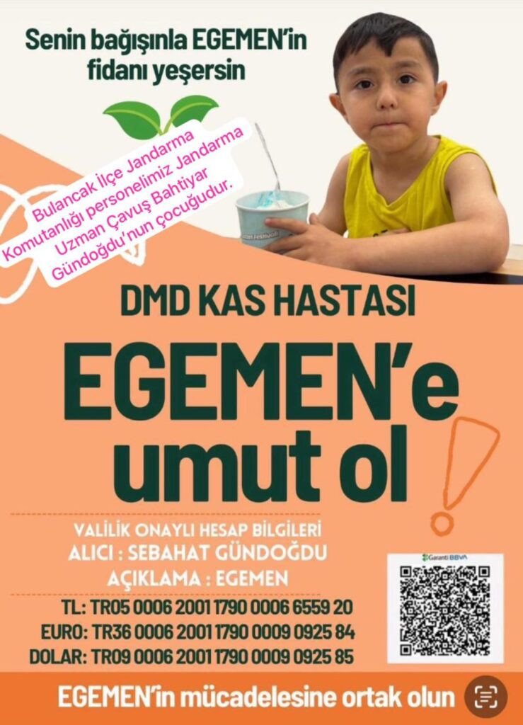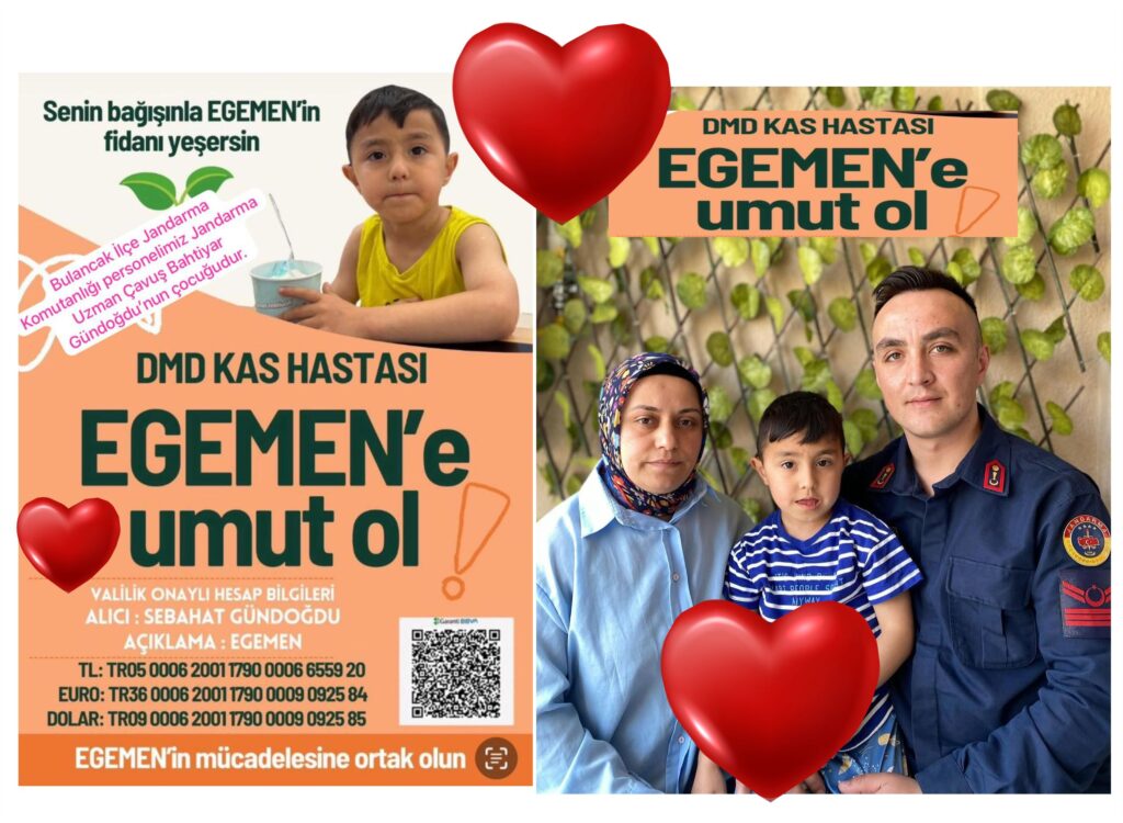 Bulancak İlçe Jandarma Komutanlığı’nda görev yapan Jandarma Uzman Çavuş Bahtiyar Gündoğdu’nun oğlu Egemen Gündoğdu, Duchenne Kas Distrofisi (DMD) hastalığıyla mücadele ediyor.