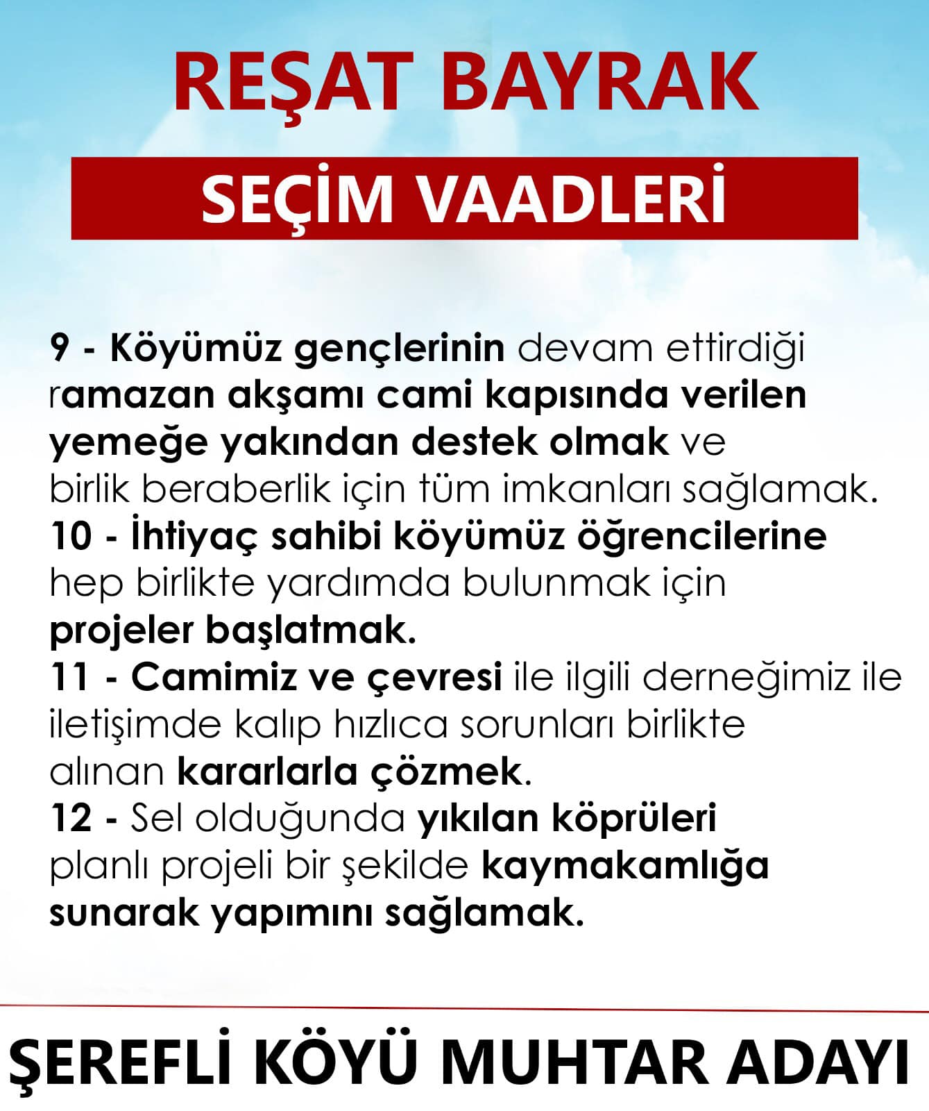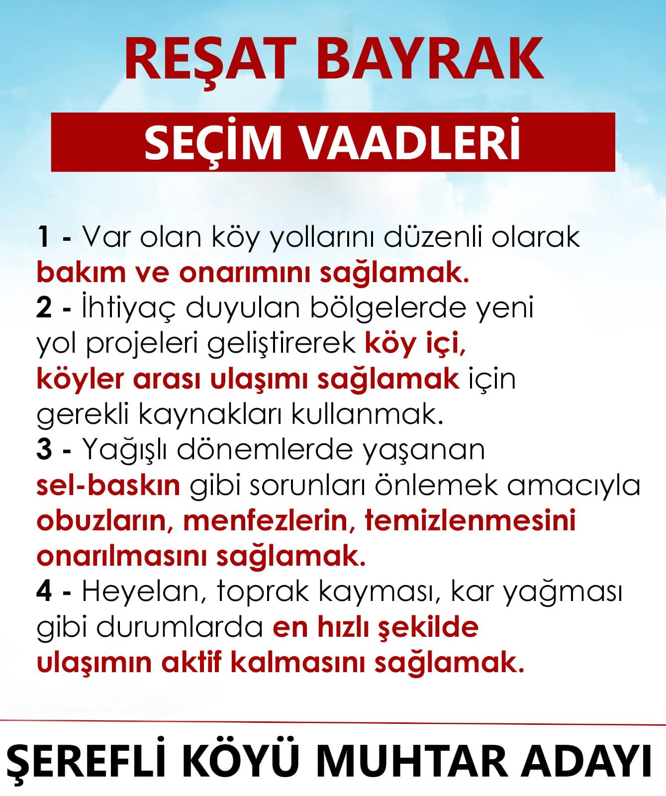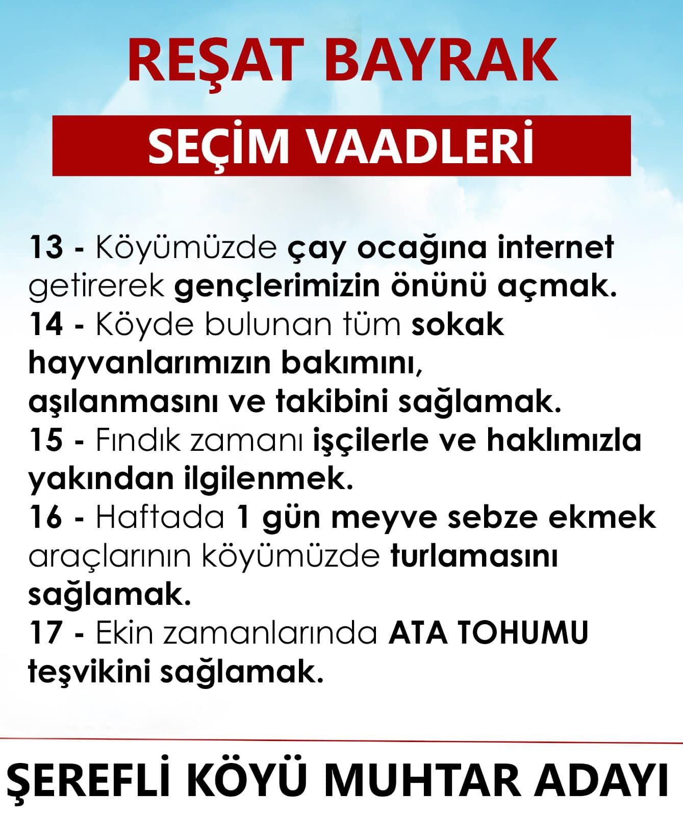 Giresun Piraziz Şerefli Köyü Muhtar Adayı Reşat Bayrak’ın 21 Maddelik Program başlığında köylüsüne vaatlerini sıraladı.