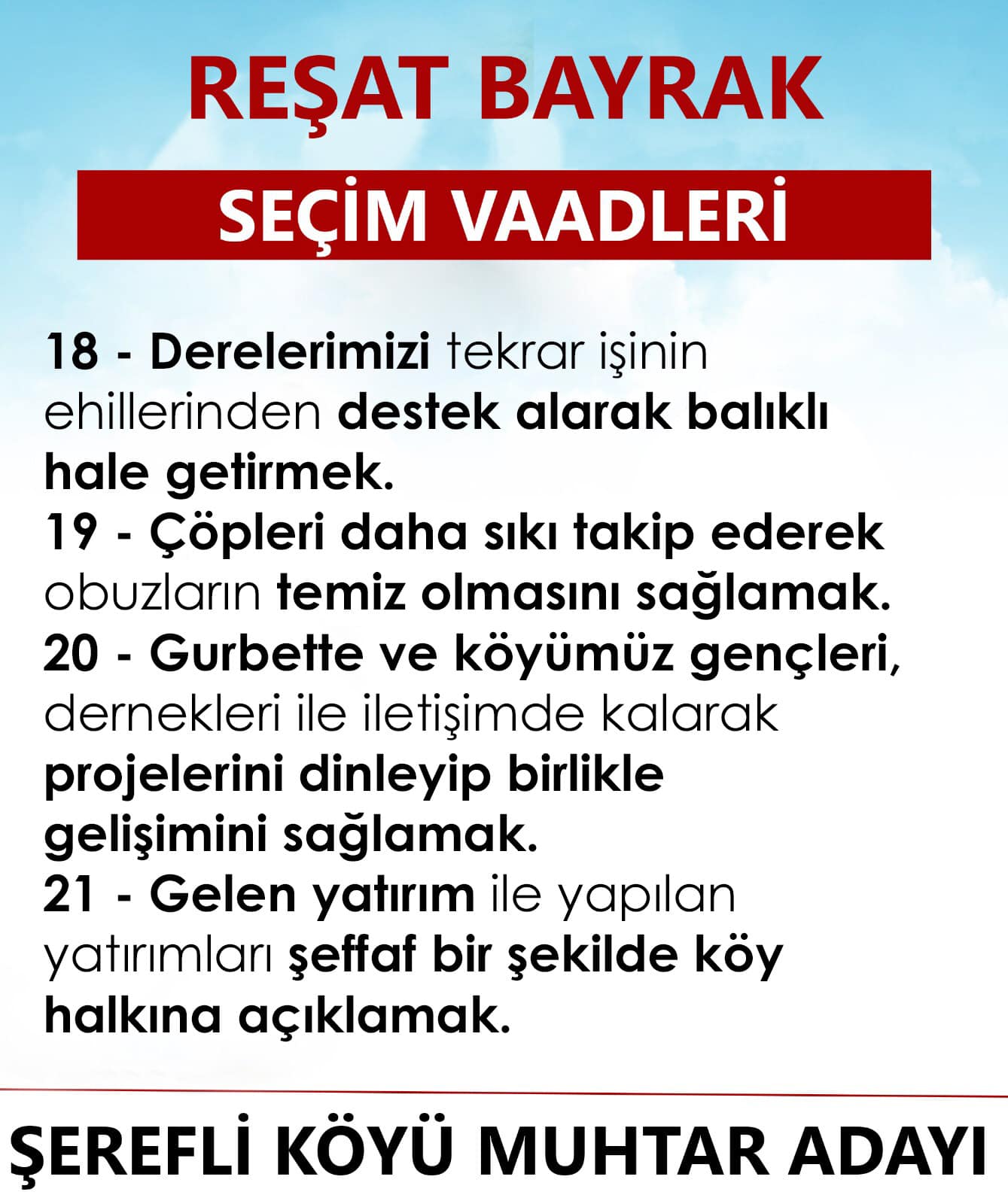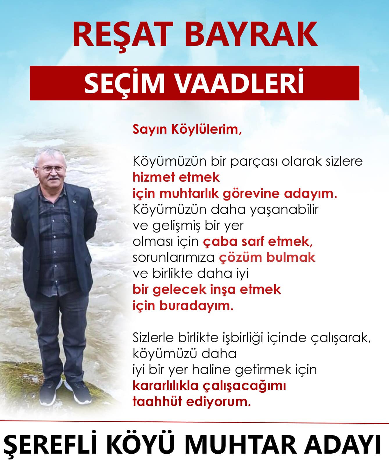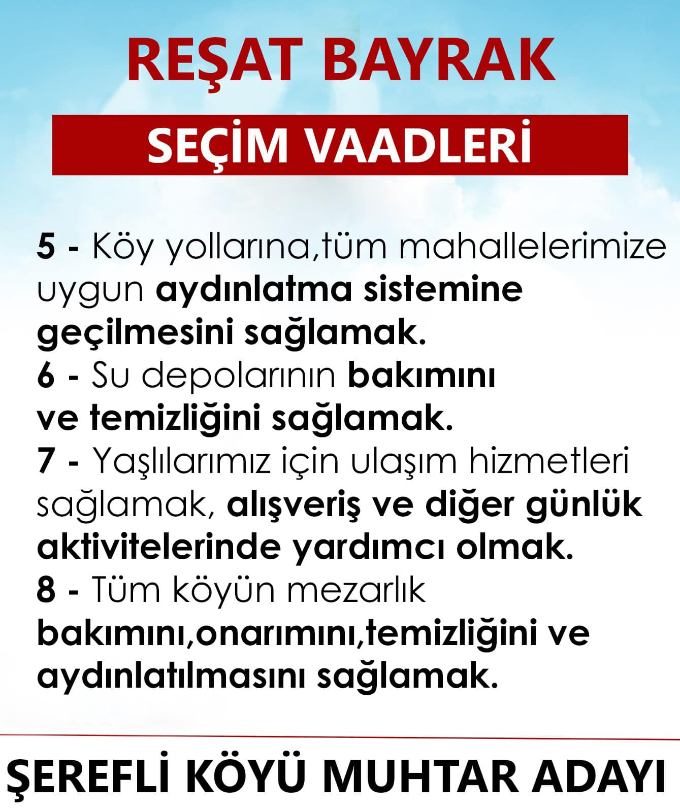 Giresun Piraziz Şerefli Köyü Muhtar Adayı Reşat Bayrak’ın 21 Maddelik Program başlığında köylüsüne vaatlerini sıraladı.
