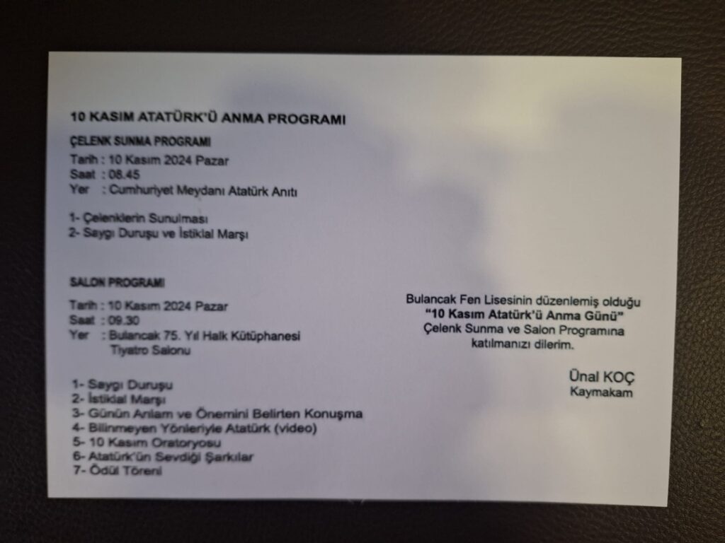 Program boyunca, Mustafa Kemal Atatürk’ün Türkiye Cumhuriyeti ve geleceği için yaptığı öngörüler, gençlerin bugünkü misyonları ile buluşacak. Gün sonunda Bulancak halkı ve öğrenciler, Atatürk’ün ilke ve değerlerini yaşatma azmiyle ona bir kez daha saygılarını sunacak.